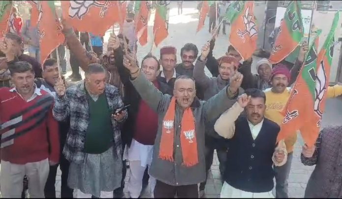 हरिपुरधार : देश के चार राज्यों में हुए विधानसभा चुनाव में तीन राज्यों राजस्थान, मध्य प्रदेश और छत्तीसगढ़ में भाजपा की जीत पर सिरमौर जिला के हरिपुरधार में भी भाजपा नेताओं ने जश्न मनाया, लड्डू बांटे और पटाखे फोड़े। तीनों राज्यों में भाजपा की जीत से गदगद हुए भाजपा नेताओं और कार्यकर्ताओं ने जमकर नारेबाजी की और जीत का जश्न मनाते हुए विजय जुलूस निकाला।