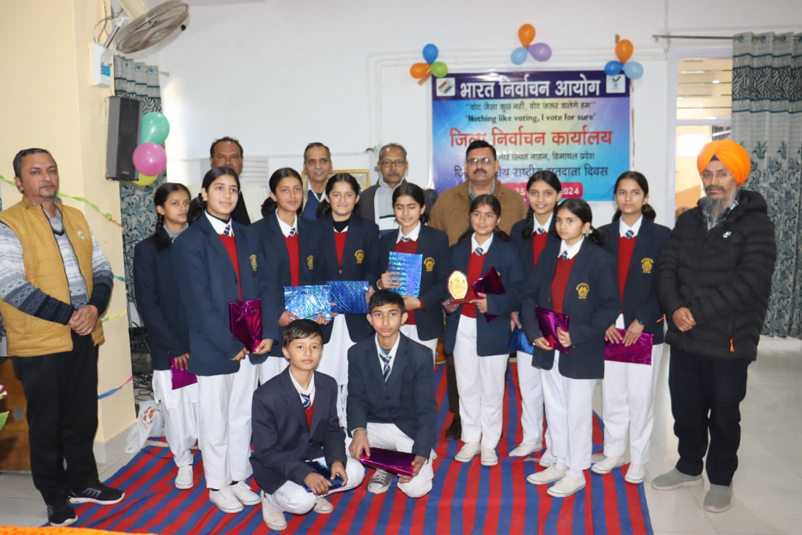 एल.आर. वर्मा ने इस अवसर पर सांस्कृतिक कार्यक्रम प्रस्तुत करने वाले विधार्थियो को पुरस्कार भी वितरित किये।तहसीलदार निर्वाचन महेन्द्र ठाकुर ने अपने सम्बोधन में मतदाता दिवस के बारे में विस्तार से जानकारी दी। उन्होंने कहा कि इस बार के लोकसभा चुनाव में  85 प्रतिशत मतदान का लक्ष्य रखा है जिसे हम सभी मिलकर पूरा करने का प्रयास करेंगे।*उपस्थित रहे*   एस.डी.एम नाहन रजनेश कुमार, विभिन्न मतदान केंद्रों के बीएलओ, निर्वाचन विभाग के अधिकारी और अन्य गणमान्य लोग भी इस अवसर पर उपस्थित रहे।